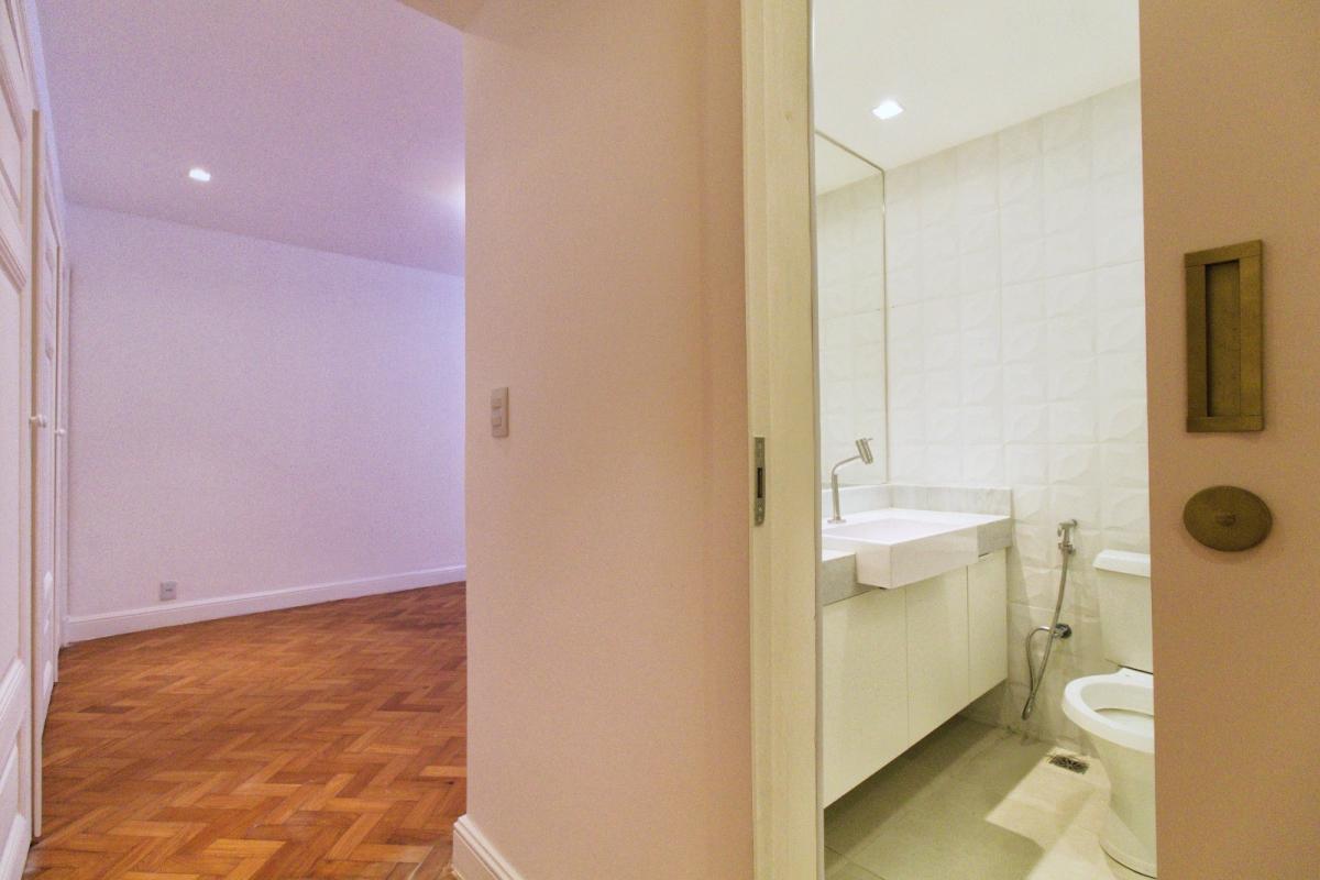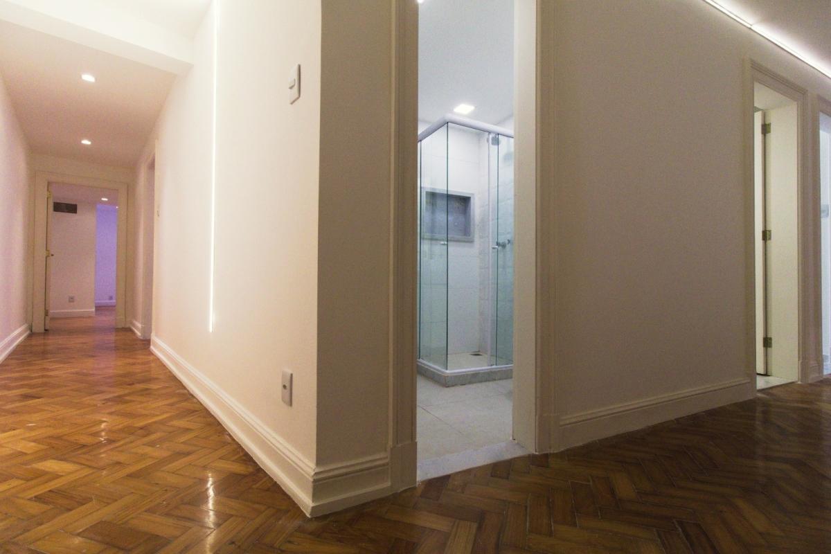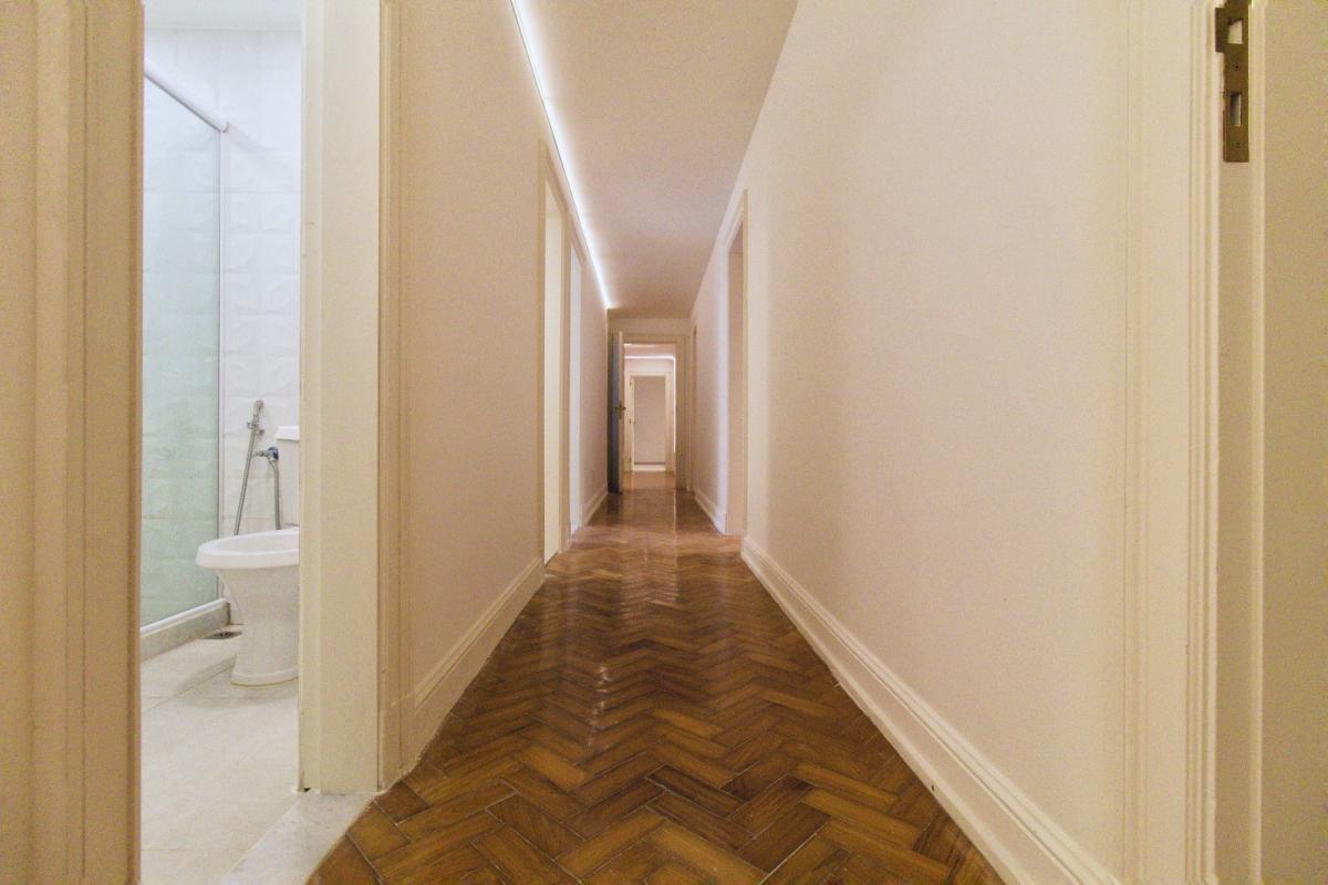 Piso parquet espinha-de-peixe nas áreas comuns; Hall de entrada com separação por belas portas duplas; Duas salas, sendo a de estar com mais de 40m² e sala de jantar com quase 30m², separadas por portas de madeira maciça; Hall de circulação social e hall de circulação de serviço; Lavabo; Ampla copa-cozinha entregue com armários Romanzza e mesa de jantar com tampo de vidro laqueado e madeira, torre quente com forno e microondas embutidos, estações de trabalho separadas com 02 cooktops, 02 coifas e 02 bancadas molhadas com pias separadas; 02 dependências completas de serviço com banheiro entre ambas, os quartos são espaçosos 13m² e 9m², sendo 1 deles revertido para escritório; Área de serviço separada da cozinha; 4 quartos, sendo 02 suítes e 2 quartos com banheiros sociais próximos (01 banheiro social para cada quarto).