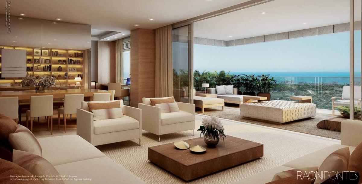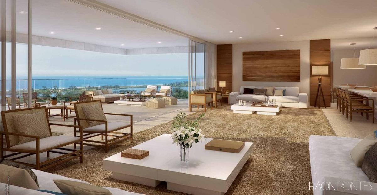 Maravilhoso apartamento lâmina 100$ mobiliado com vista livre para o mar, Lagoa e para o verde em condomínio na Barra da Tijuca. São 269m² com salão em 3 ambientes, linda varanda com cortina de vidro, 4 ótimas suítes, lavabo, cozinha planejada com copa, área de serviço e dependência completa. Sol da manhã. Piso porcelanato. Armários. Ar condicionado Split. 4 vagas de garagem. Condomínio com lazer de resort e portaria com segurança 24 horas.