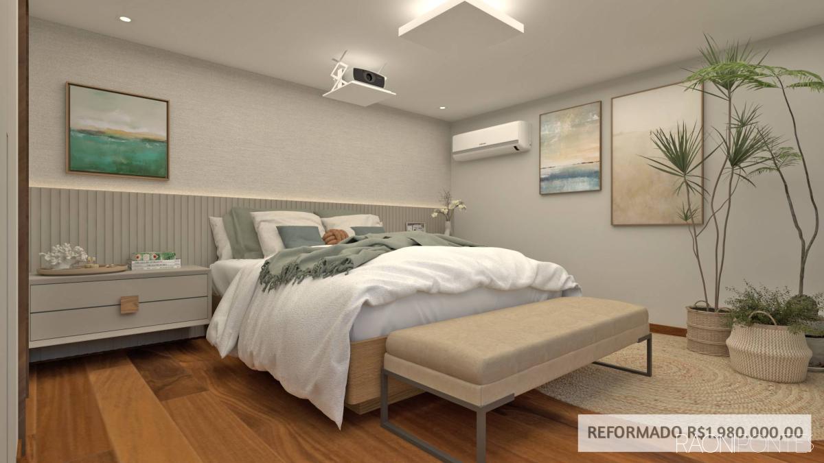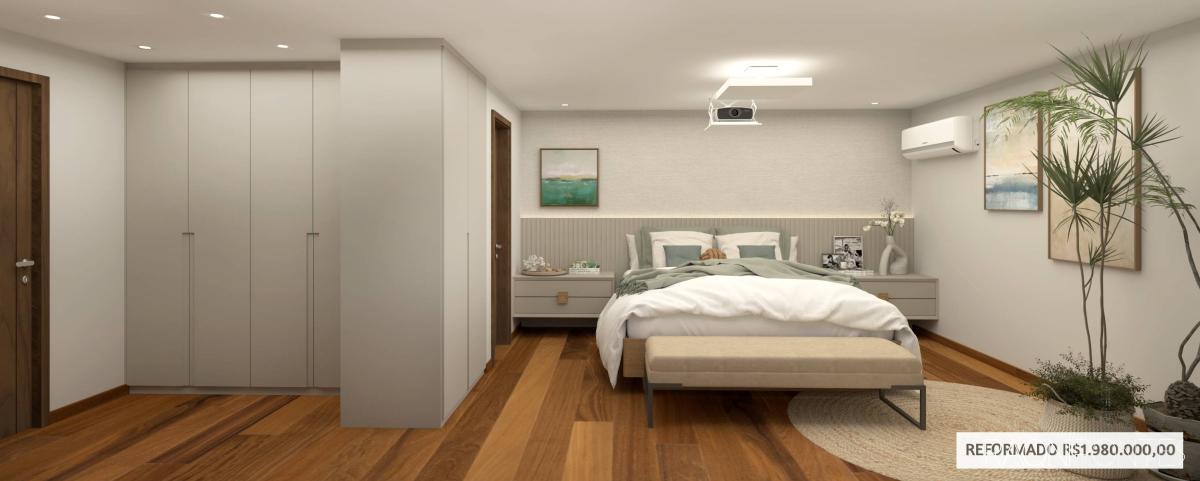 1º pavimento: 174m²; 4 Quartos, sendo uma suíte máster com banheira e box separados, com vista para o jardim e verde; 2 quartos servidos por banheiro social e 4º quarto atendido por banheiro ligado à circulação; os 3 quartos da frente com acesso à varanda e área externa.