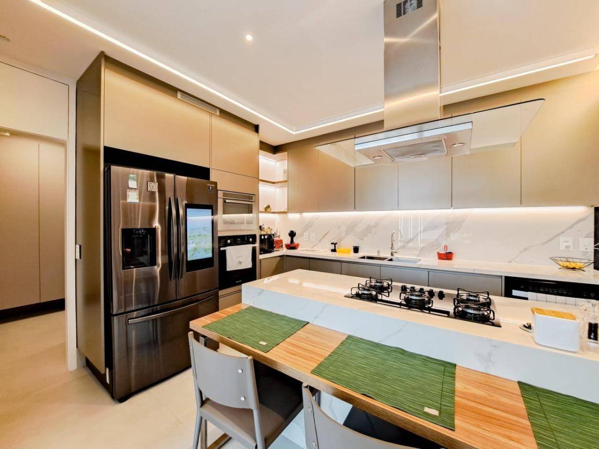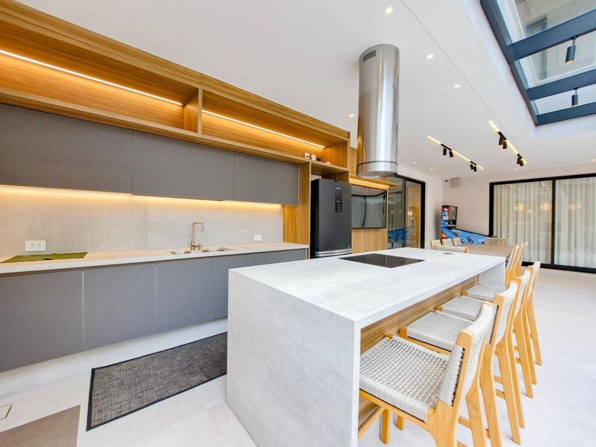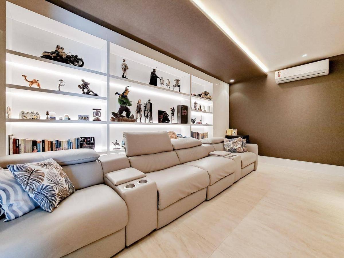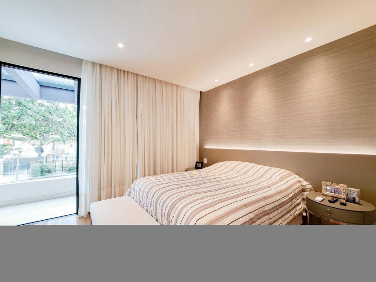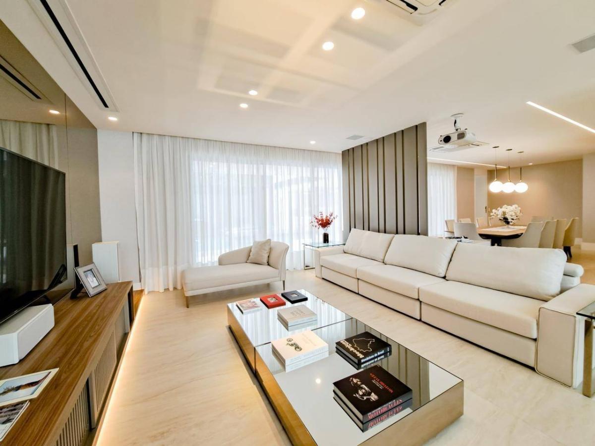 O imóvel tem 5 quartos, sendo 5 suítes, possui 7 banheiros, 3 salas e 4 vagas de garagem.