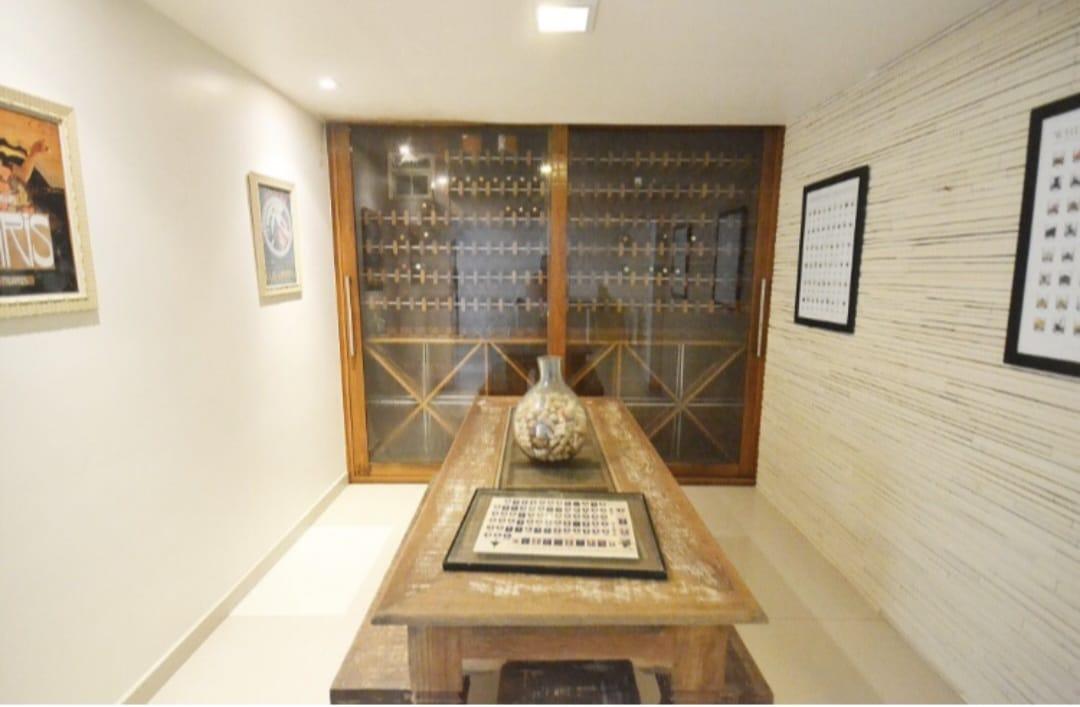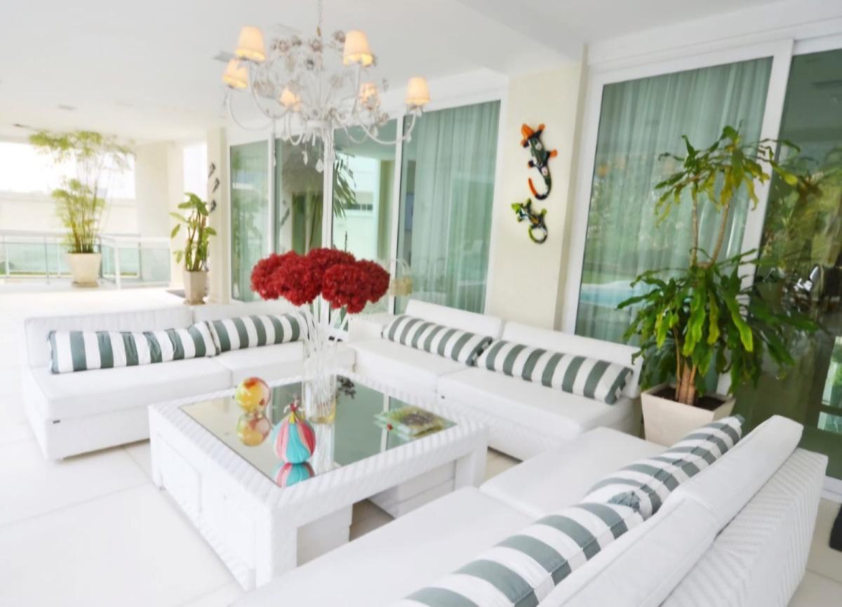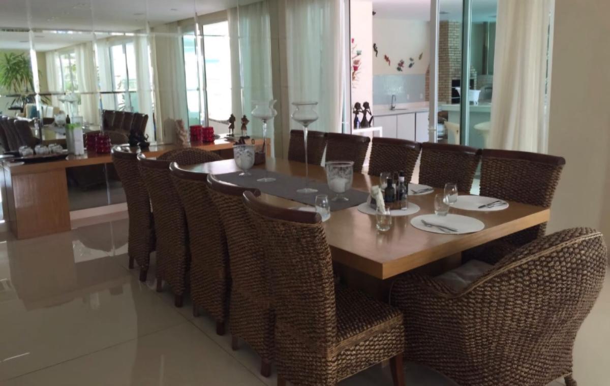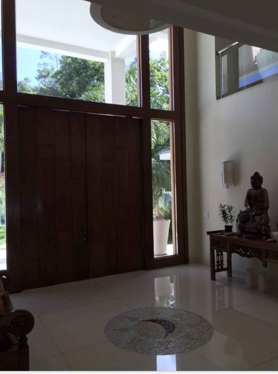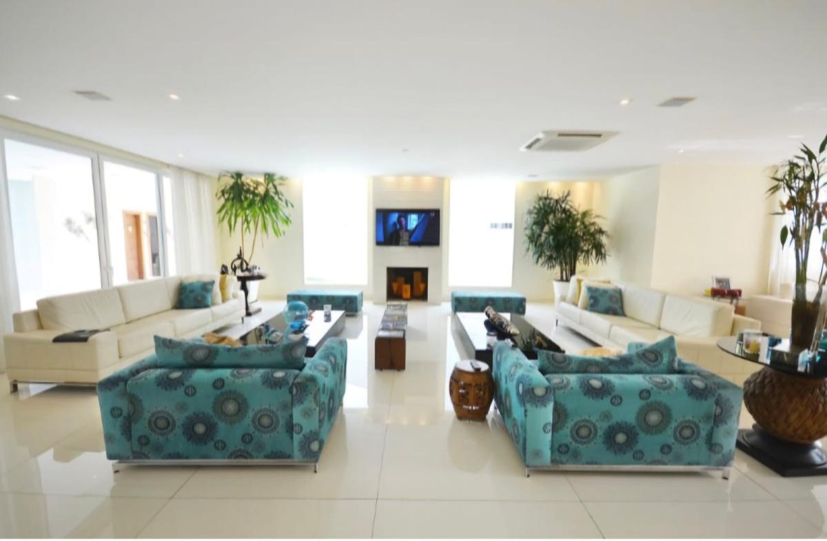 A casa tem um excelente hall de entrada com pé direito duplo e portal em vidro e madeira, sala em 4 ambientes com lareira e cortinas de águas, copa cozinha, área de serviço, duas dependências de empregados, dispensa para louças, ateliê, garagem coberta para 4 carros, varandas, churrasqueira Gourmet, sauna interligada com a hidromassagem, piscina com iluminação colorida de Led, riacho com árvores frutíferas. O segundo andar possui 5 suítes com closets e varandas e o terceiro andar com Home Theater, espaço japonês, com varandas, Copa e banheiro.