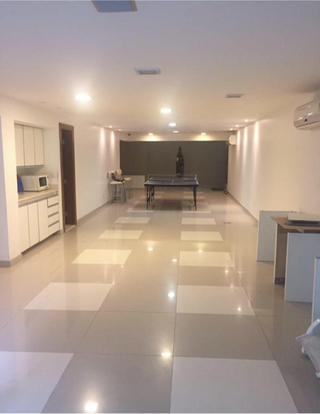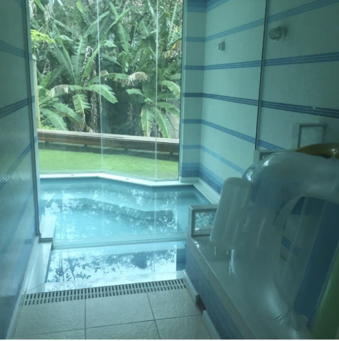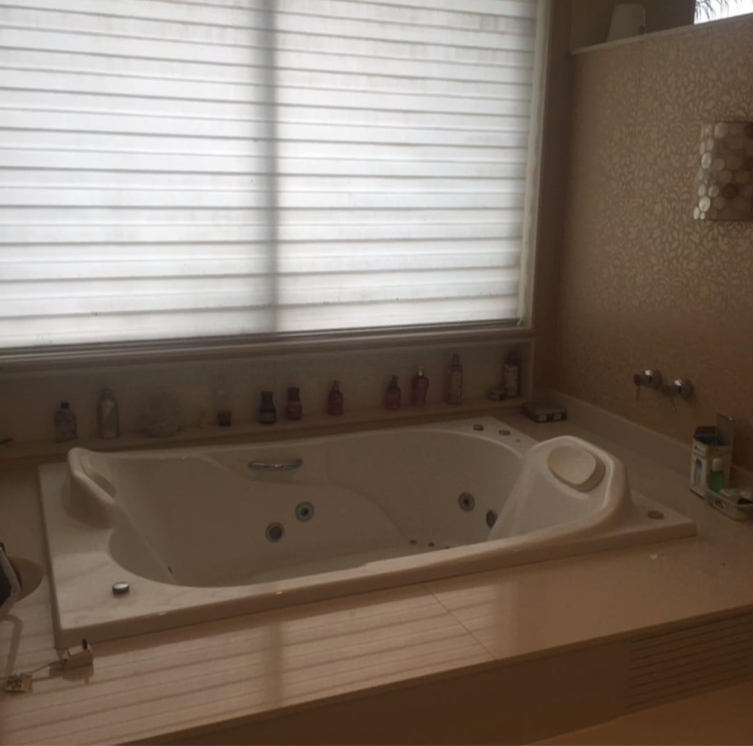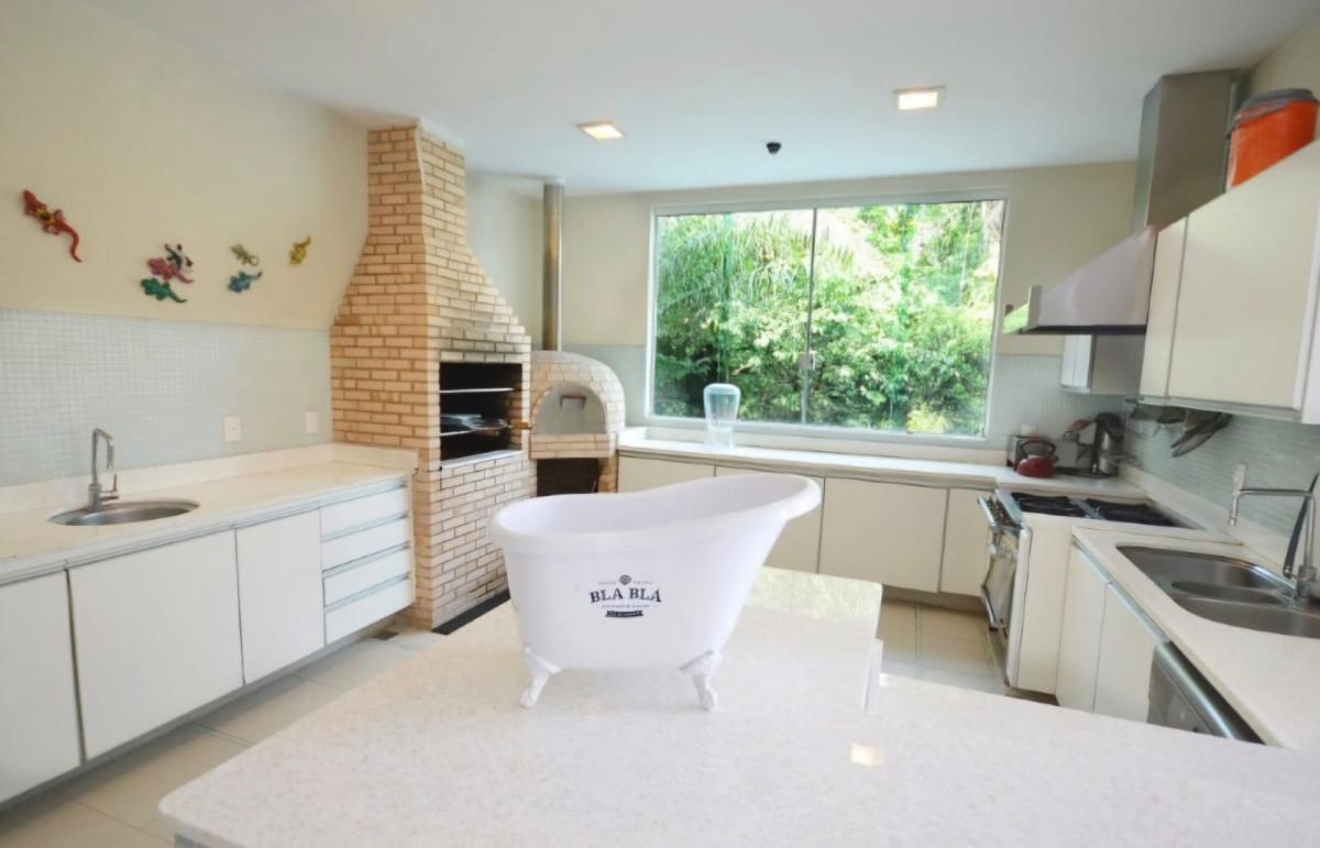 A casa tem um excelente hall de entrada com pé direito duplo e portal em vidro e madeira, sala em 4 ambientes com lareira e cortinas de águas, copa cozinha, área de serviço, duas dependências de empregados, dispensa para louças, ateliê, garagem coberta para 4 carros, varandas, churrasqueira Gourmet, sauna interligada com a hidromassagem, piscina com iluminação colorida de Led, riacho com árvores frutíferas. O segundo andar possui 5 suítes com closets e varandas e o terceiro andar com Home Theater, espaço japonês, com varandas, Copa e banheiro.